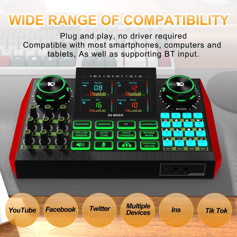 - 【ALL IN ONE and EASY TO USE】: Works as an audio mixer station. Integrating audio mixing equipment into 1 comprehensive solution. It delivers superb sound quality and offers intuitive and full control to optimize vocal and sound effects. The G9 podcast equipmentcomes that lets you start podcasting, live streaming,dj easily in no time. Start recording when you plug into the smartphone or PC.