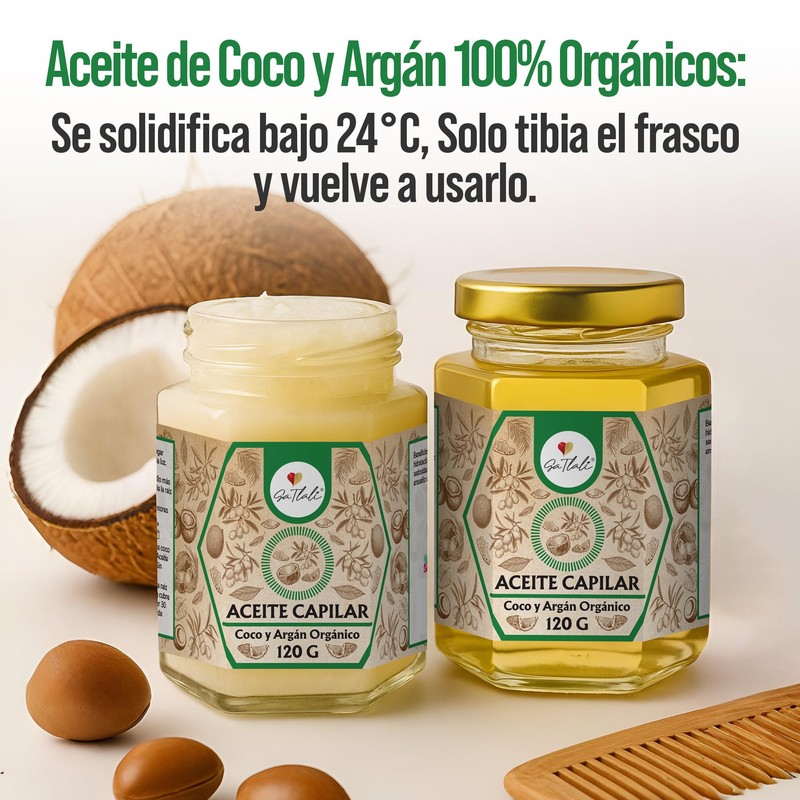 - ¿Qué es el Aceite Capilar de Coco y Argán Ga Tlali? Es un aceite para el cuidado capilar formulado con ingredientes naturales como el aceite virgen de coco (Cocos nucifera) y aceite de argán (Argania spinosa). Está diseñado para hidratar y proteger el cabello desde la raíz hasta las puntas.