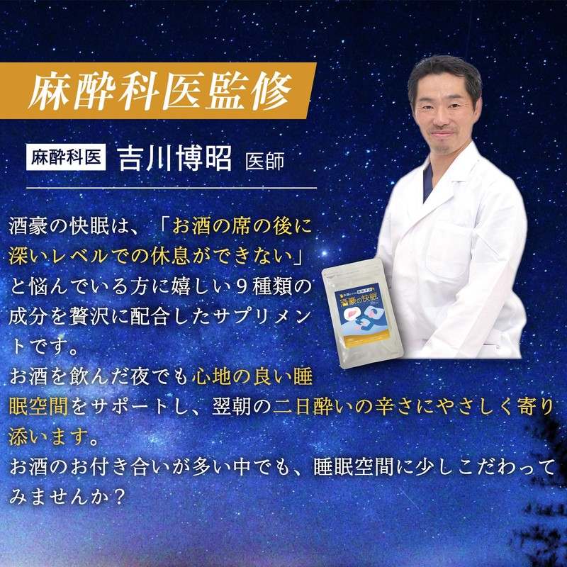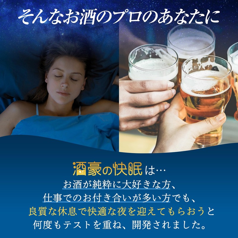 ■こんな悩みありませんか? ・次の日朝早いのについつい飲みすぎてしまう事が多い ・二日酔いの日でもハツラツとした1日を迎えたい ・お酒を飲んだ日はベッドでモヤモヤする そんなあなたのお悩みに徹底的に寄り添います。 ■酒豪の快眠は… お酒が純粋に大好きな方、仕事でのお付き合いが多い方でも、良質な休息で快適な夜を迎えてもらおうと何度もテストを重ね、開発されました。 ■麻酔科医監修 酒豪の快眠は、「お酒の席の後に深いレベルでの休息ができない」と悩んでいる方に嬉しい9種類の成分を贅沢に配合したサプリメントです。お酒を飲んだ夜でも心地の良い睡眠空間をサポートし、翌朝の二日酔いの辛さにやさしく寄り添います。お酒のお付き合いが多い中でも、睡眠空間に少しこだわってみませんか?■最大の特徴は今までなかった斬新な融合 お酒の席が多い方のおやすみ空間に嬉しい成分をたくさん詰め込みました! ウコン・オルニチン・シジミエキス x グリシン・GABA・テアニン ■安心安全の国内GMP認定工場で製造 お客様の安心安全を第一に考え、高品質かつ信頼性の高い商品づくりを心がけ、国内GMP認定工場で製造しております。 また、大事なお客様により良い商品をお届けできるよう、じっくり時間をかけ、品質管理を一つ一つおこなっております。
