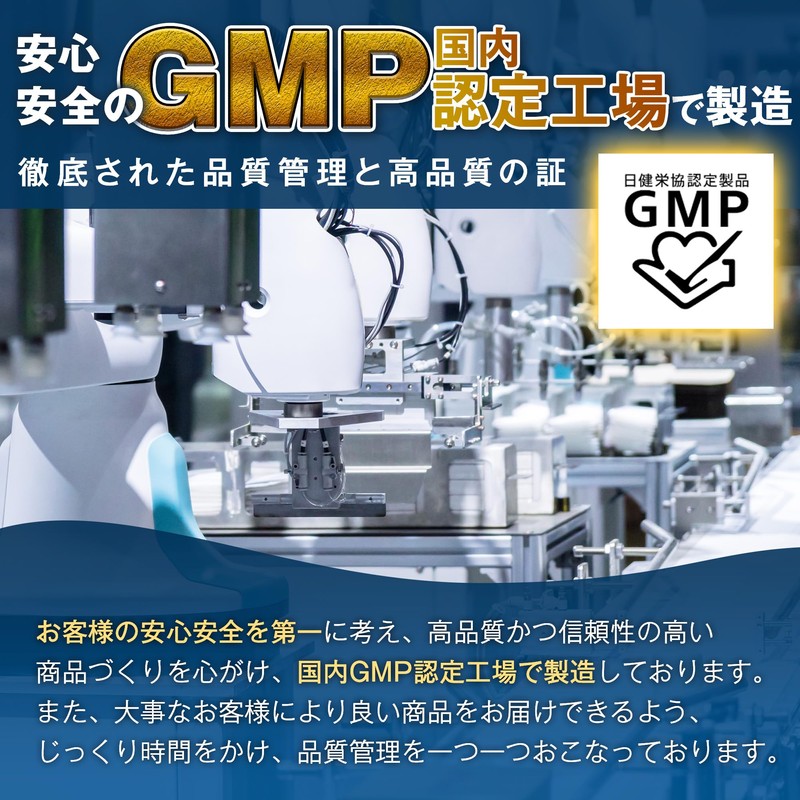 • 安心安全の国内GMP認定工場で製造 お客様の安心安全を第一に考え、高品質かつ信頼性の高い商品づくりを心がけ、国内GMP認定工場で製造しております。 また、大事なお客様により良い商品をお届けできるよう、じっくり時間をかけ、品質管理を一つ一つおこなっております。