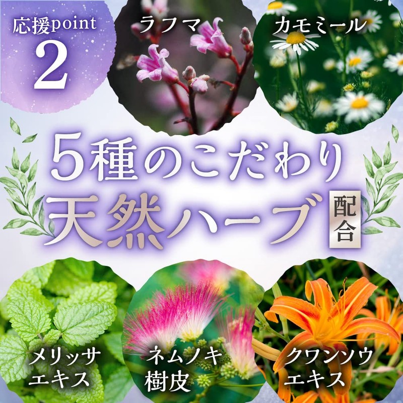 - 5種類のハーブや植物由来の天然成分(ラフマ、カモミール、メリッサエキス、ネムノキ樹皮、クワンソウエキス)配合