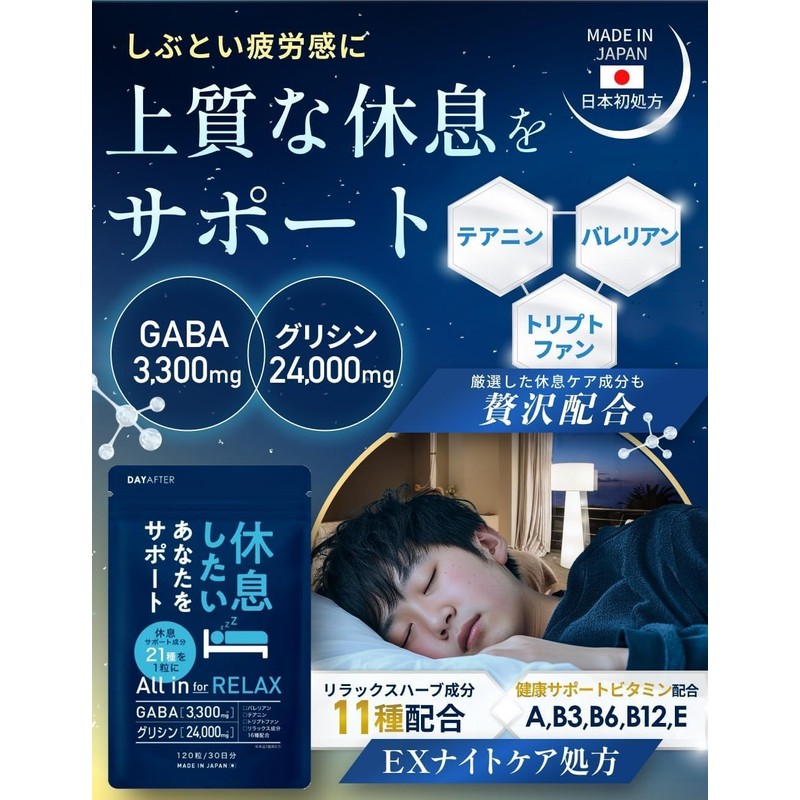 - 【休息ケア成分5種を配合したEXナイトケアサプリ】より皆様が快適出来るよう、厳選したケア成分(GABA・グリシン・テアニン・バレリアン・トリプトファン)を配合し、EXナイトケアサプリにいたしました。