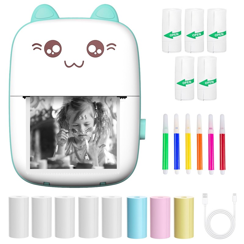 • 【Package details】 With thermal printing tech and high-quality print head, thermal paper instead of ink, quieter, faster and more energy-efficient.Mini thermal printer come with 13 rolls of paper , Includes 5 rolls of white thermal paper, 3 rolls of colored thermal paper, 5 rolls of self-adhesive paper and 5 colored pens and an instruction manual are complimentary.