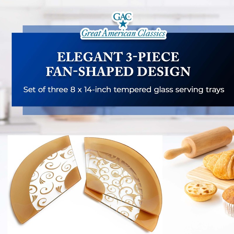 - ELEGANT 3-PIECE FAN-SHAPED DESIGN - Transform your table settings with this set of three 8x14-inch tempered glass serving trays. Arrange them together for a sophisticated 16-inch round platter, ideal as a decorative centerpiece or versatile serving solution for any occasion.