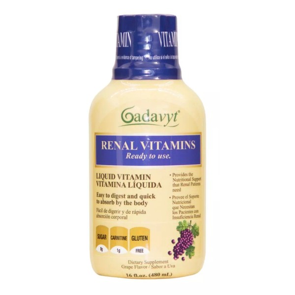 Gadavyt Renal es una vitamina líquida diseñada para las necesidades específicas de los pacientes renales dializados.