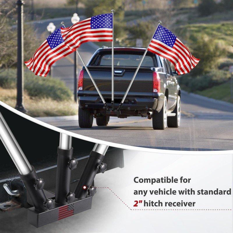 - Widely Application The trailer hitch flag pole holder compatible for any vehicle with standard 2" hitch receiver, such as trucks, JEEP, trailers, SUVs, RVs, pickups,campers, etc. Suitable for a wide range of models, it can better help you fix 3 flags at once.