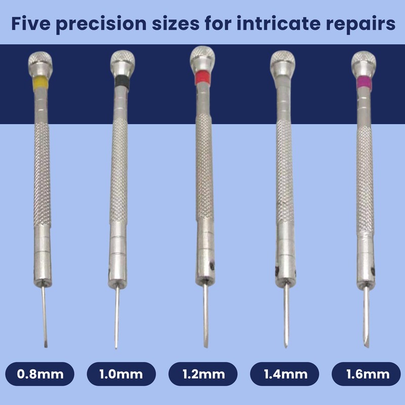 - Five sizes for versatile use: This compact and lightweight watchmaker screwdriver set includes 5 precision sizes - 0.8mm, 1.0mm, 1.2mm, 1.4mm, and 1.6mm. Each size is thoughtfully chosen to cater to various repair tasks.