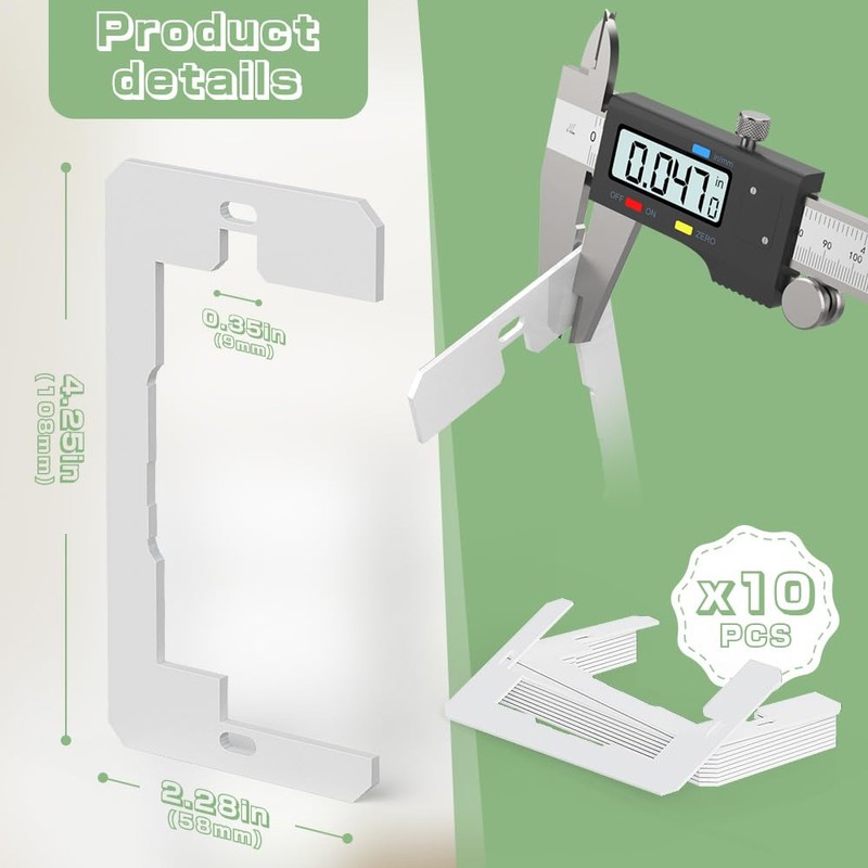 - - Exact size for perfect fit: Each electrical outlet spacers shims measures 0.047 x 2.28 x 4.25 inches, offering a precise fit for a wide range of outlet fix. These dimensions are carefully calibrated to ensure compatibility with standard electrical box thicknesses and to maintain a seamless and professional appearance