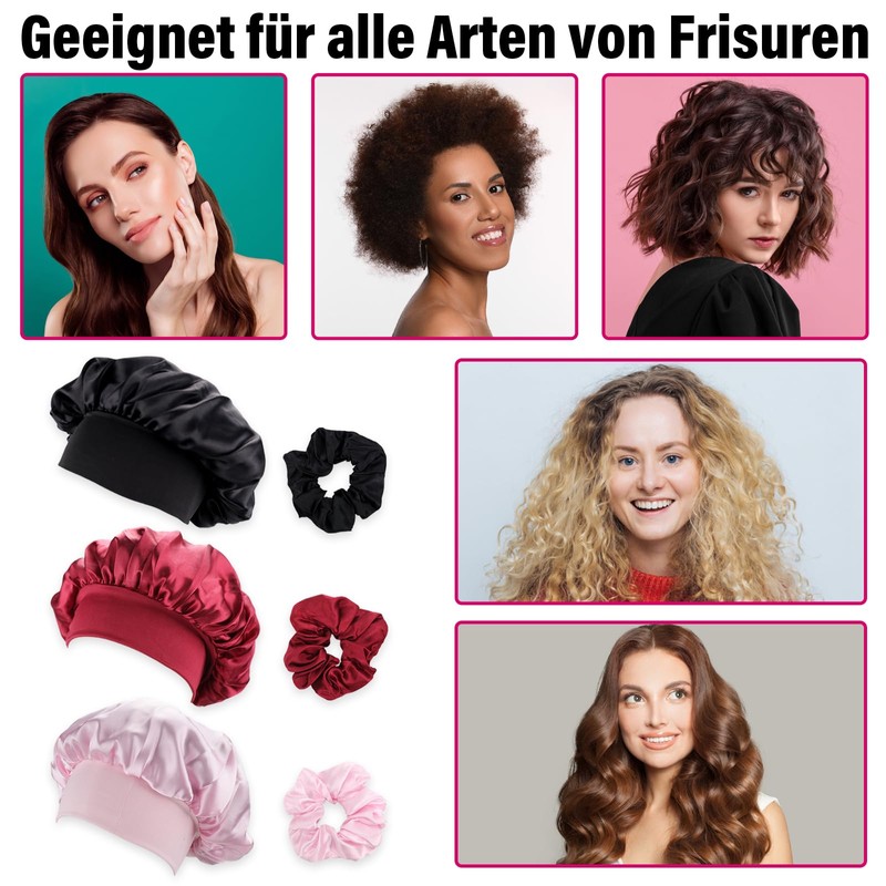 - Packaging: 3 stylish silk sleep caps in black, beige and reddish brown as well as 3 matching satin hair bands. These caps are suitable for all hair types - whether straight, curly, short or long hair, thin or full hair. Multiple packs offer you more choices, can be twisted, conveniently changed and washed and can be used both at home and when travelling.