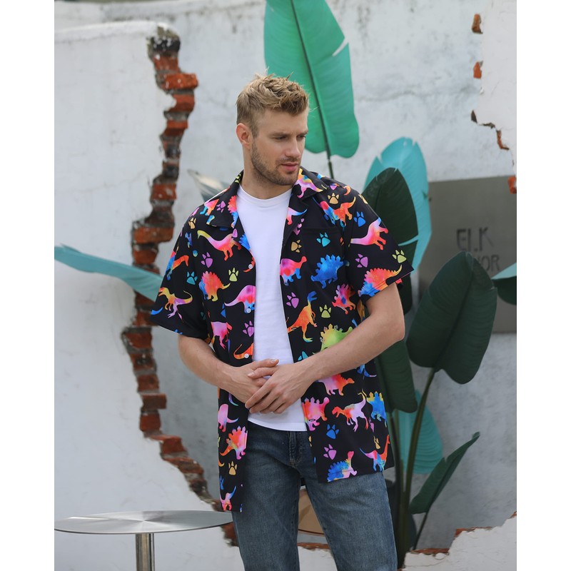 • [Fashion Dinosaur Design Inspiration]GADZILLE rainbow dinosaur button down shirt for men is designed in a unique hawaiian style, with a classic regular fit, spread collar, button down and left breast pocket, easy wearing. Printed dinosaur pattern shirt for men with a vivid print that is casual yet stylish, exquisite and gorgeous colors, retro chic, let your temperament shine.