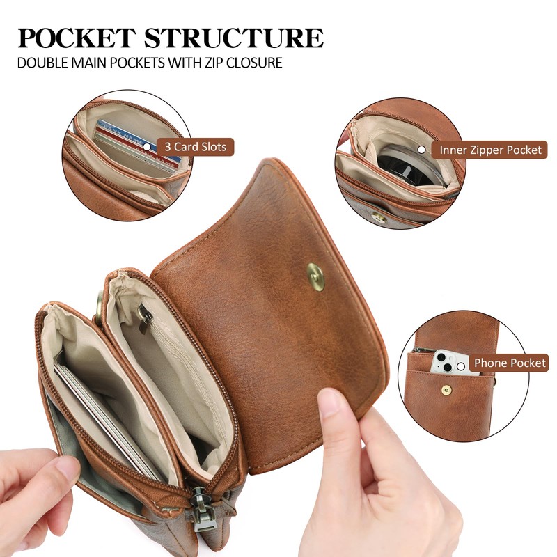 - Versatile and Practical Cell Phone Purse: This trendy phone bags for women crossbody 2 main zipper compartments + 1 front flap magnetic snap pocket + 3 interior card slots + 1 interior zipper pocket + 1 back zip pocket. Multiple compartments and pockets are large enough to hold cellphones, cash, credit cards, coins, and other small things, providing easy access and efficient organization for your life