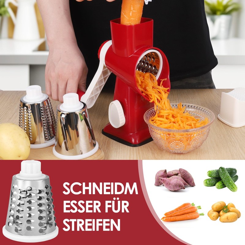 - 3-in-1 drum vegetable grater: This stainless steel rotary chopper is a versatile set with three functions: a blade for cutting, one for grating and one for grinding. No blade assembly required. It cuts cucumbers, zucchini, potatoes, carrots, peanuts, nuts, biscuits, cheese, nuts, chocolate and much more. An essential tool for the kitchen.