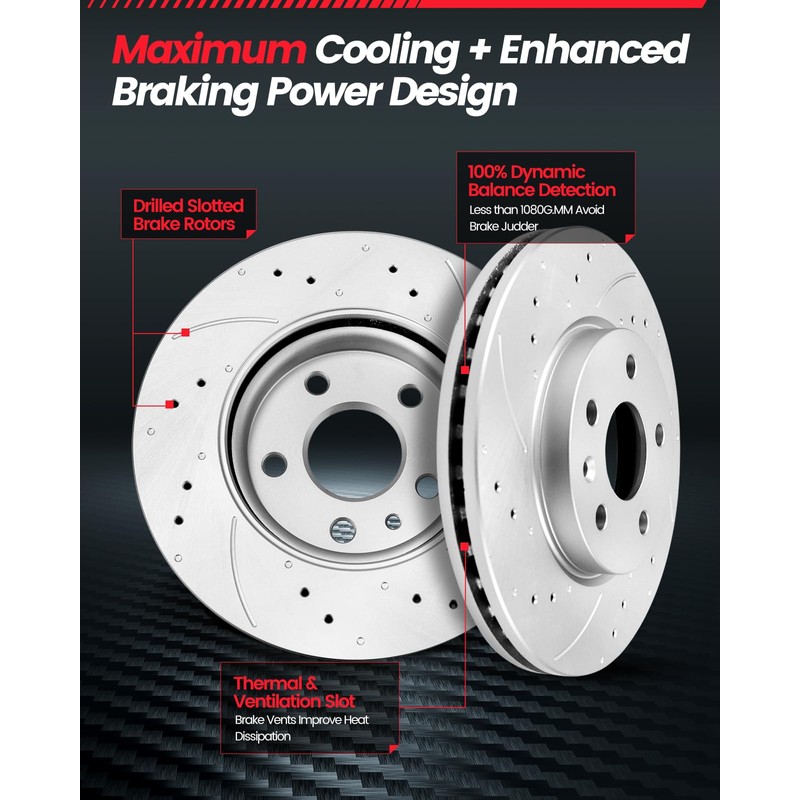 - [Brake Kits Include]: 2 x Rear drilled and slotted brake rotors-【53024】 + 4 x Rear ceramic brake pads (hardware included)-【D1057A-8292】. The diameter of this brake rotors is 【320mm(12.6in)】