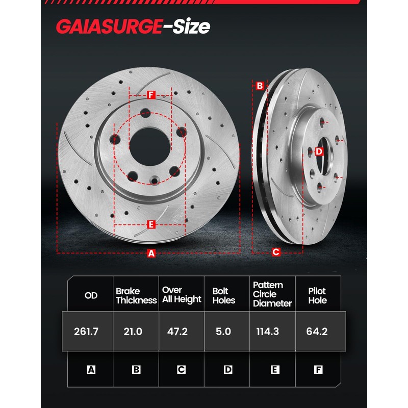- Silent, Comfortable Ride: GAIASURGE brake pads and rotors kit feature slotted, chamfered edges and stainless-steel shims, reducing brake noise and absorbing vibration. Enjoy smooth, quiet stops without the usual squeaks, adding to a comfortable and refined driving experience every day.