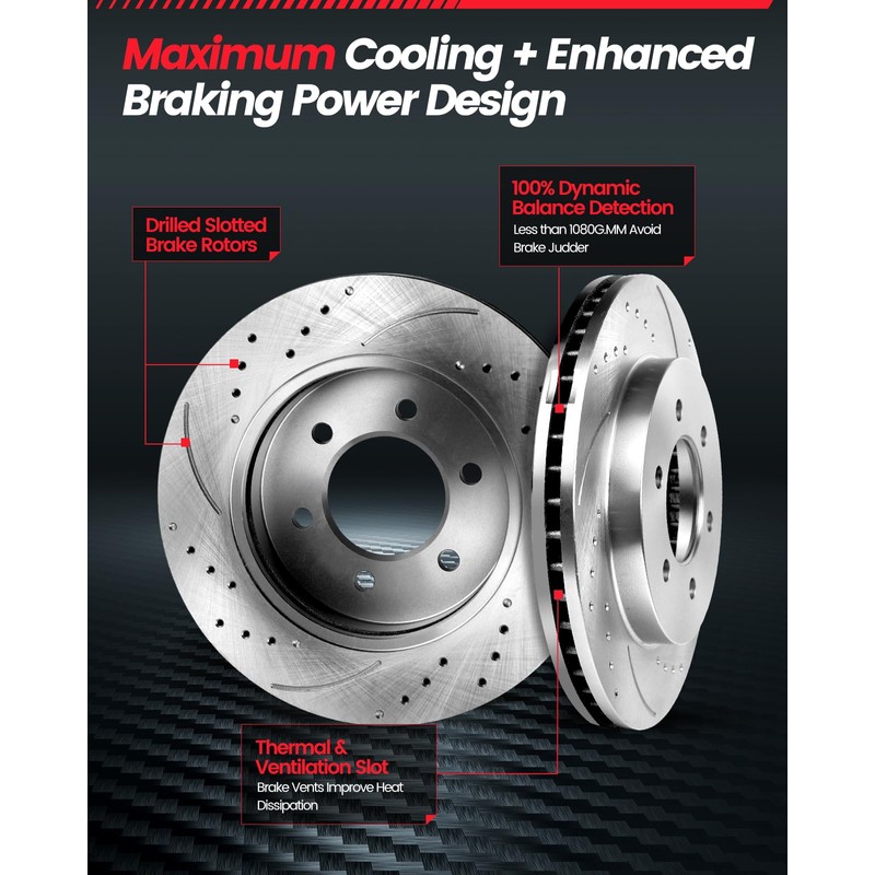 - [Precision Engineering & Noise-Free]: Automotive replacement brake kits undergo meticulous processing for exceptional precision, ensuring smoother braking and reduced pad wear. With a static balance of just 114g.mm and minimal flatness tolerance, brake rotors optimize performance while providing durability. Say goodbye to noisy brakes and enjoy a quieter, safer driving experience.
