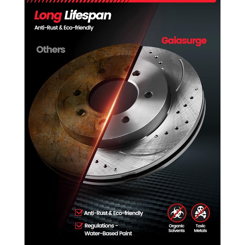 - [Keep Stability & Durability]: Elevate driving with GAIASURGE brake pads and rotors kit, crafted from high-carbon alloy for unparalleled stability. Engineered with precision and boasting a flatness tolerance as low as 0.05mm, GAIASURGE rotors ensure consistent performance, eliminating hardness issues. Resisting cracking and deformation, they offer longevity and optimal performance.