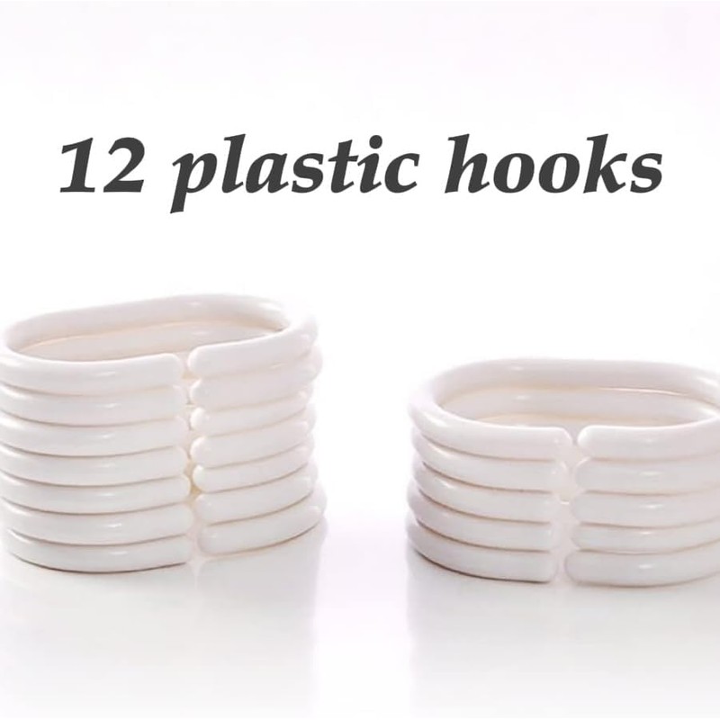 - What’s Included: One shower curtain, 12-pack plastic shower hooks.