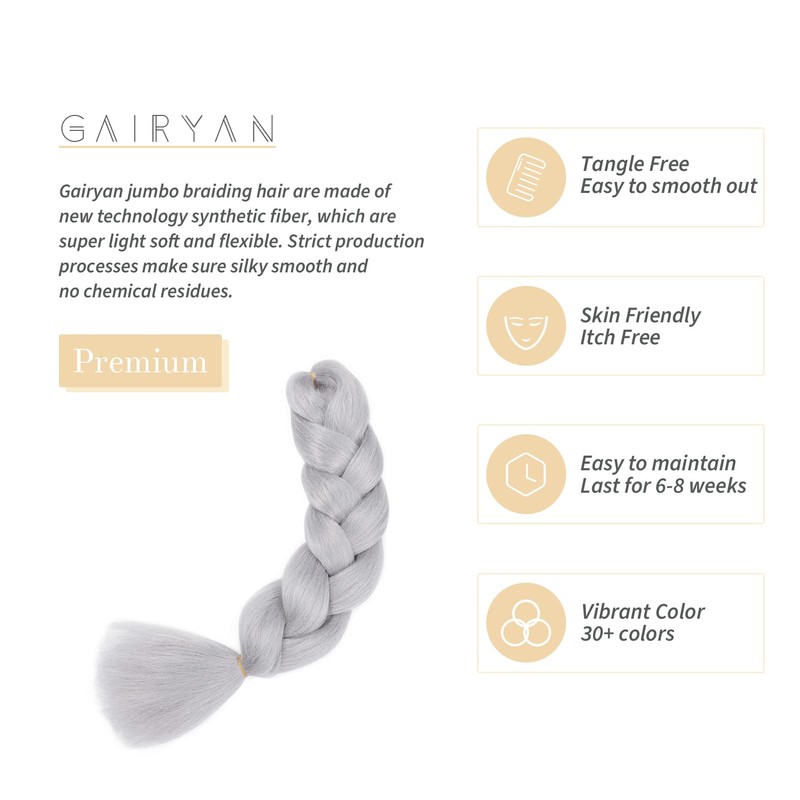 Gairyan’s braiding hair use yaki synthetic fiber. This material is easier to braiding. The braided braids are also smoother and not knotted. We have more than 30 colors for you to choose from. Meanwhile, we have four packing specifications. If you have other requirements, you can also contact us. We support personal customization to meet your needs as much as possible.