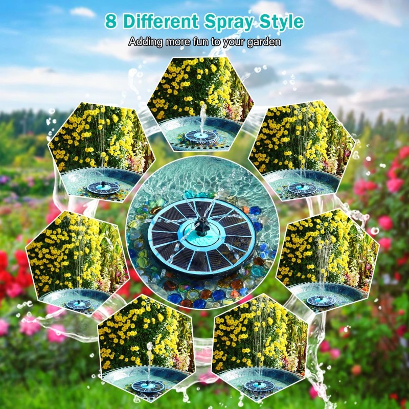 8 VERSATILE SPRAY MODES FOR DYNAMIC DISPLAYS: Customize your outdoor ambiance with 8 stunning spray modes; From a gentle, soothing flow to a bold, lively spray, this solar-powered fountain creates a variety of eye-catching effects that will beautify any outdoor setting