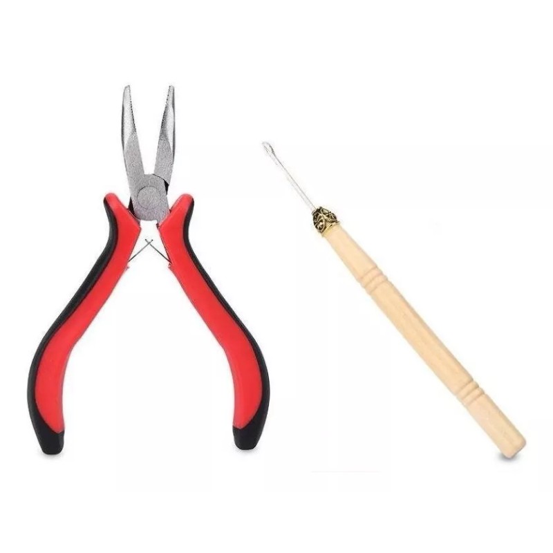 *Alicate de punta curva de acero inoxidable color negro con rojo con sus mangos en acabo de goma suaves y aguja gancho de madera con un acabado barnizado suave al tacto estas herramientas son para la aplicación de extensiones de cabello .