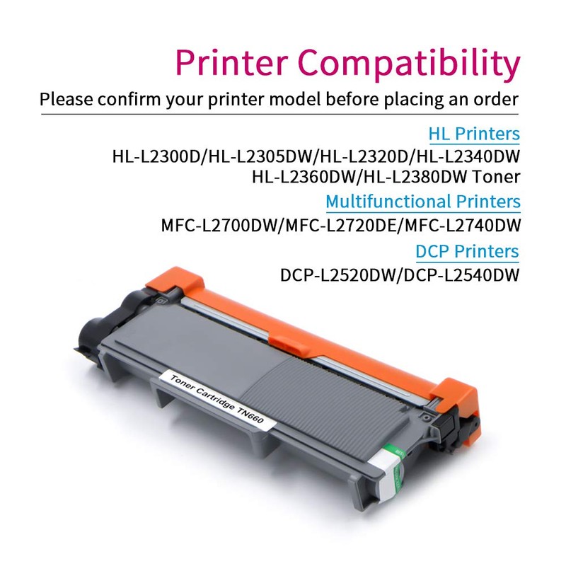 - Compatible Printers:Brother DCP L2520DW, DCP L2540DW, HL L2300D, HL L2305W, HL L2315DW, HL L2320D, HL L2340DW, HL L2360DW, HL L2380DW, MFC L2680W, MFC L2685DW, MFC L2700DW, MFC L2705DW, MFC L2707DW, MFC L2720DW, MFC L2740DW