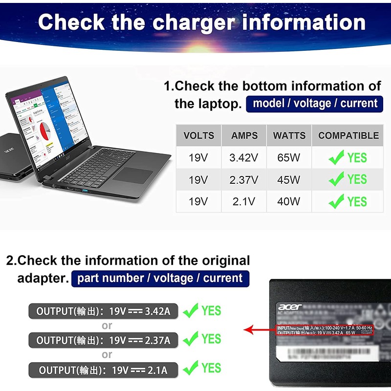 - Output: 19V 3.42A 65W (Also compatible to 19V 2.15A 40W); World Wide Input Voltage 100-240VAC 50/60Hz