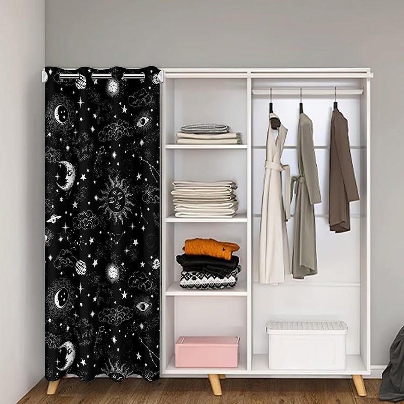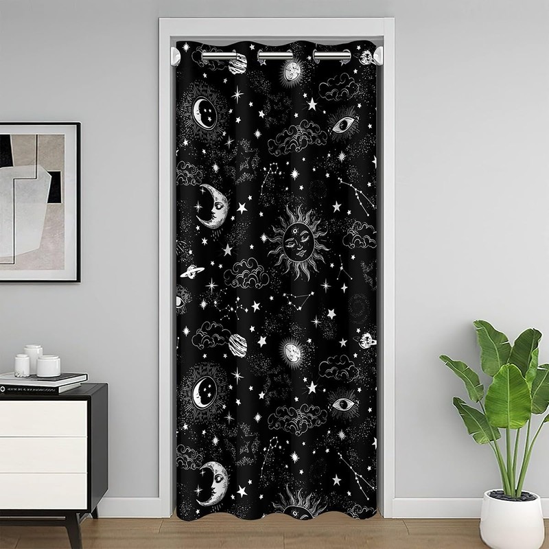 Galaxy Planet Door Curtain for Doorway Privacy, Sun and Moon Starry Sky Room Divider, Dark Night Cloud Insulated Cover for Bedroom Closet, 1 Panel, 42x80 Inch, Black White