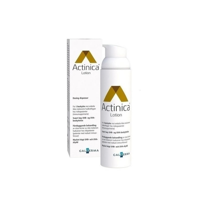 Actinica Lotion 80g is a medical product to prevent from different forms of non-melanoma skin cancers in patients at risk (immunosuppressed) and is efficient in the prevention of actinic keratosis and squamous cell carcinoma. Protecting from UVA and UVB rays, this lotion contains filters with photostable large spectrum and is resistant to water, it moisturizes and maintains the skin. Fragrance-free and PEG-free, it is really tolerated and can be used for sensitive skins.