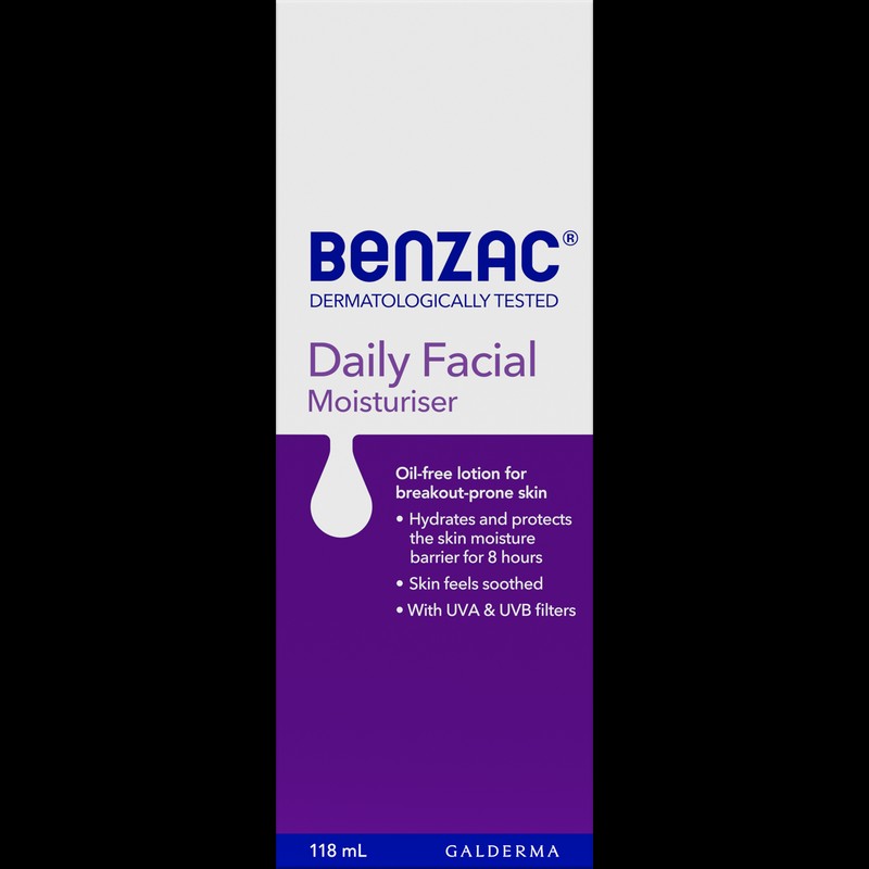 Benzac Daily Facial Moisturiser hydrates, soothes and protects the skin's moisture barrier for up to eight hours. Enriched with UVA/UVB filters, this oil-free, non-comedogenic lotion is specially formulated for breakout-prone skin.