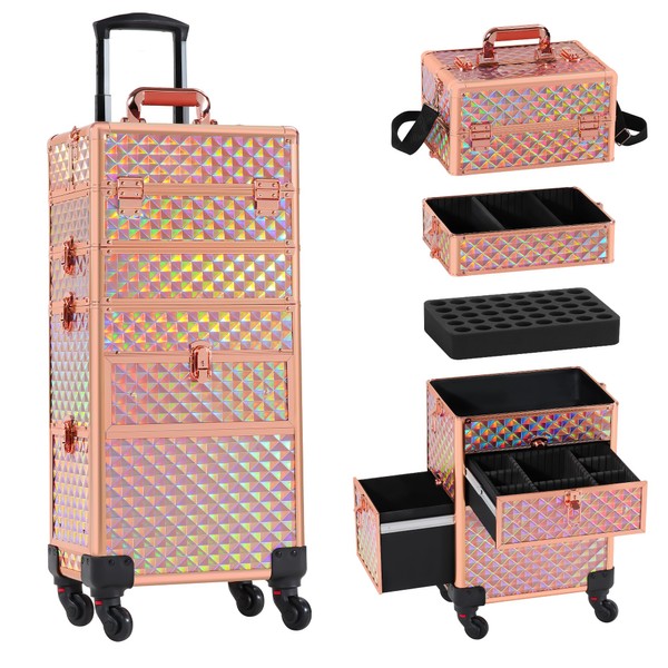 GALHUBIS Makeup Train Case with Drawer, Rolling Makeup Case, Cosmetology Case on Wheels, Gift, Large Makeup Case Organizers, Professional for Salon Barber, Nail, Tattoo, Rose Gold