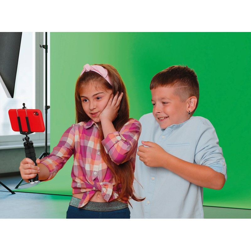 - Contents: the experiment video yourself set consists of a tripod on which almost any smartphone can be mounted and a green screen with which you can make the background disappear in the video