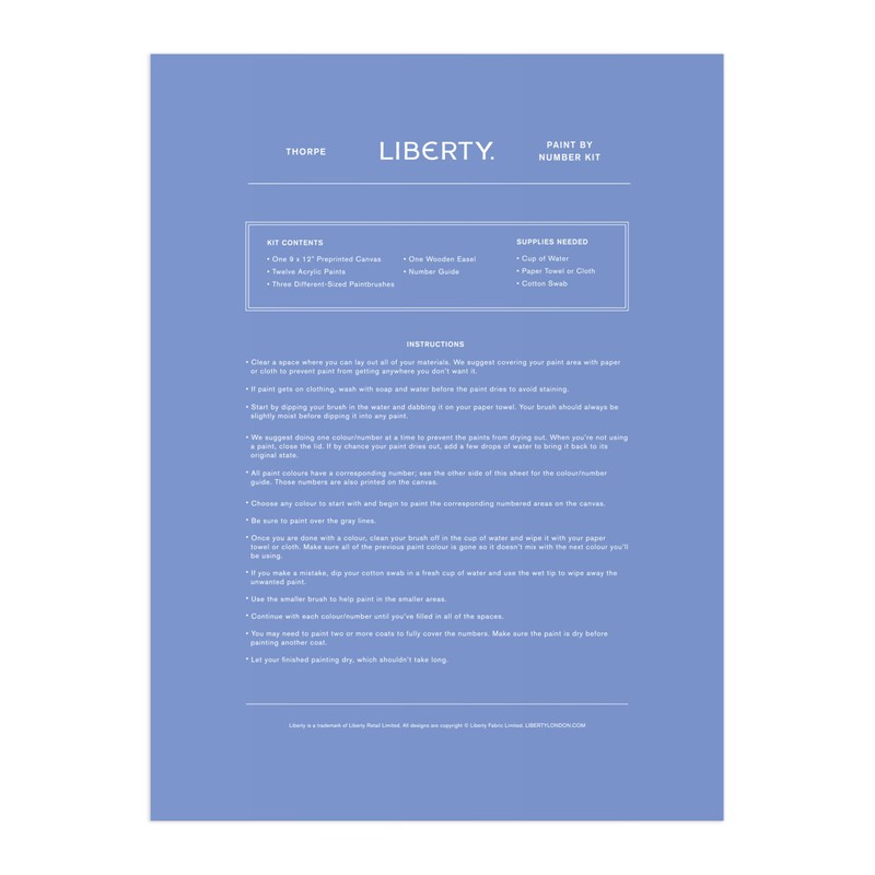 - PAINT BY NUMBER KIT – The Liberty Thorpe 9x12 Paint by Number Kit from Galison includes everything you need to create a beautiful art painting of one of Liberty's most iconic prints. This kit makes the perfect gift for fashion enthusiasts and art lovers, ideal for holidays, birthdays, or any occasion. Includes 12 acrylic paints, a paint brush, and a beautiful canvas to paint on.