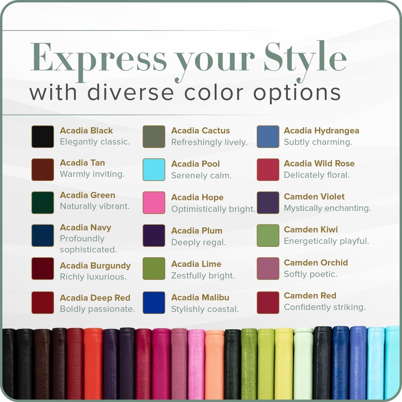 When it comes to aesthetics, we offer a range of options to suit every preference. Whether you prefer the glossy finish of Acadia, the rough and matte texture of Camden, the smooth mixed textures of Freeport, or the unique crosshatch pattern of Key West for pocket addresses, each option exudes sophistication and elegance, adding a touch of style to your desk or pocket.