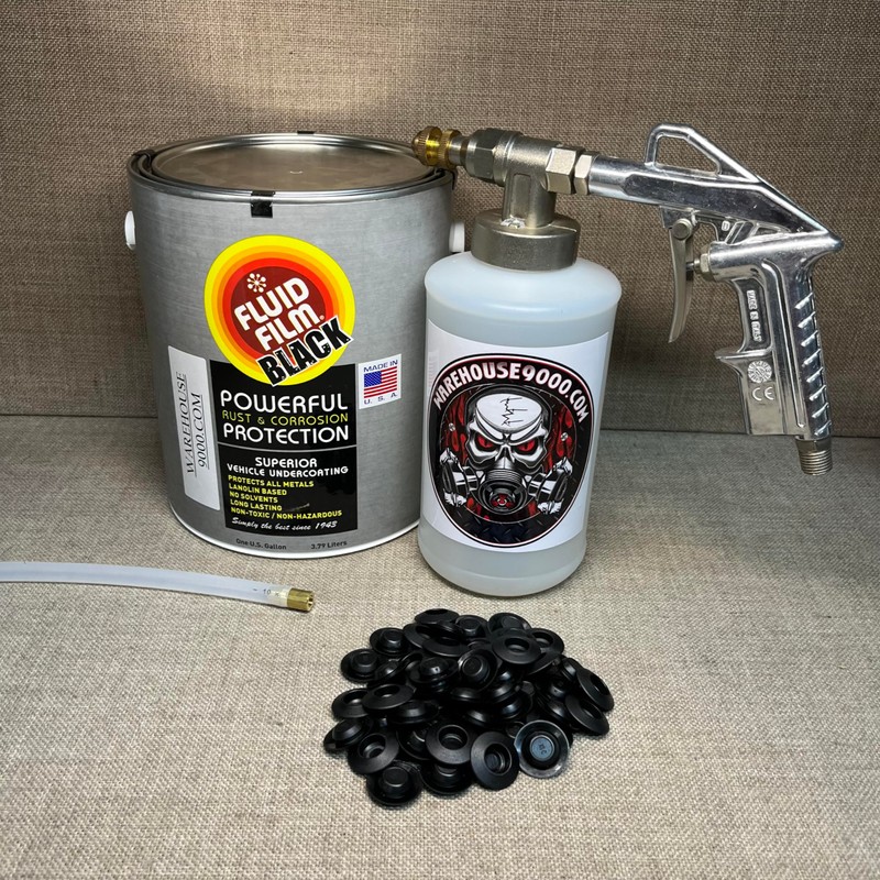 Gallon Fluid Film Black, Pro Undercoating Spray Gun, 32" 360* Wand, 1 White Quart Bottle, and 50 Rust Plugs