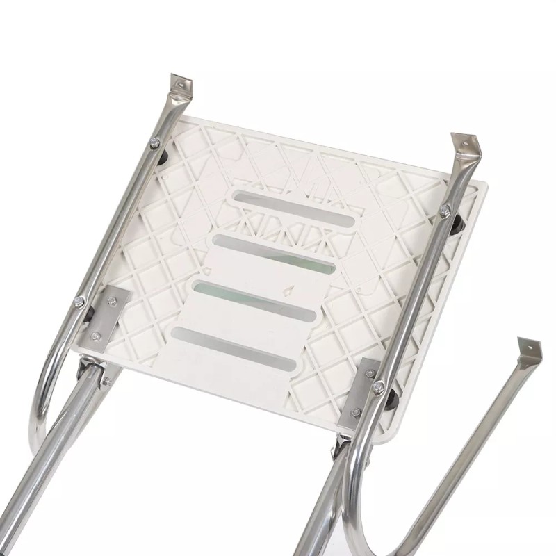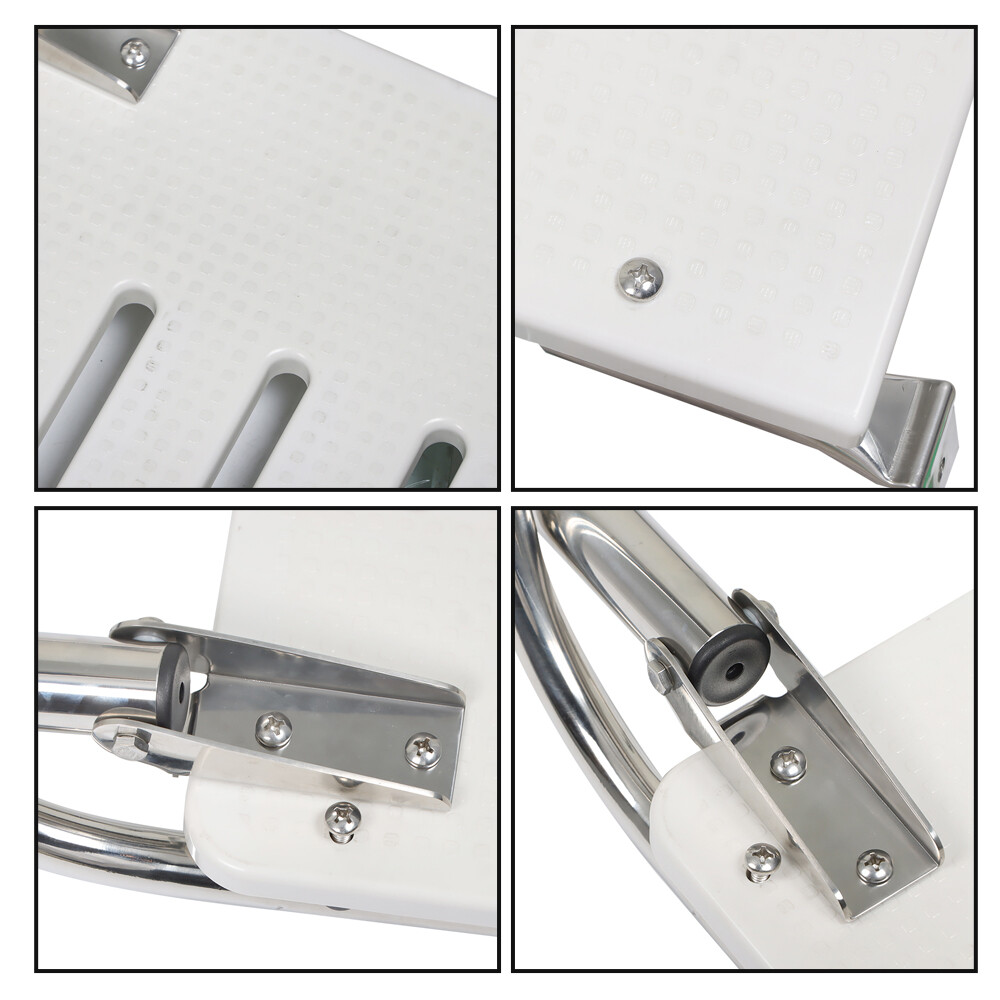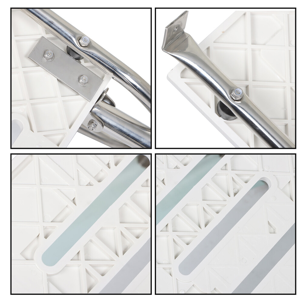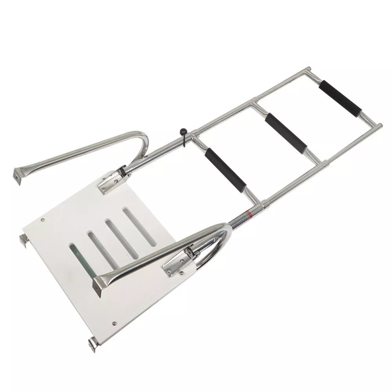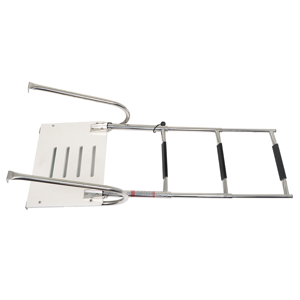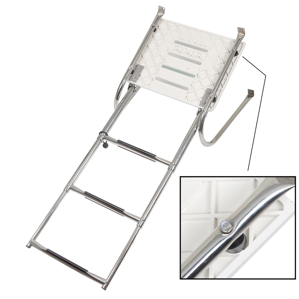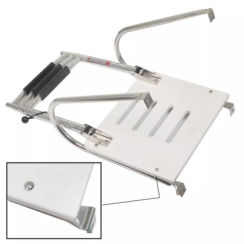 Description: -Dimensions: The Width between the two handrails is 16.45 inch; the fully extended ladder length of the 3-Step stainless steel ladder is 34.56 inches and the width of the step is 14.68inch; the size of the white fiberglass platform is 17.99inch( Length) x 14.13inch(Width) x 1.06inch(Thickness) -Material: Made of marine grade 304 stainless steel & durable fiberglass, with guaranteed quality, it’s not easy to be damaged. The supper proof-load of the extendable ladder is enough to support swimmers or divers. The ladder is also safe and reliable since every step has a slip-proof plastic tread(7.16inch Length x 1.49inch Width). -Flexibility: The ladder is not only collapsible, but also telescoping, and the attached Velcro strap can make its two steps compact. -Practicability: Thanks to its simple design and the included mounting hardware, this step ladder is super easy to assemble and use; in addition to boats, it's also suitable for swimming pools, docks, pontoons, and more.