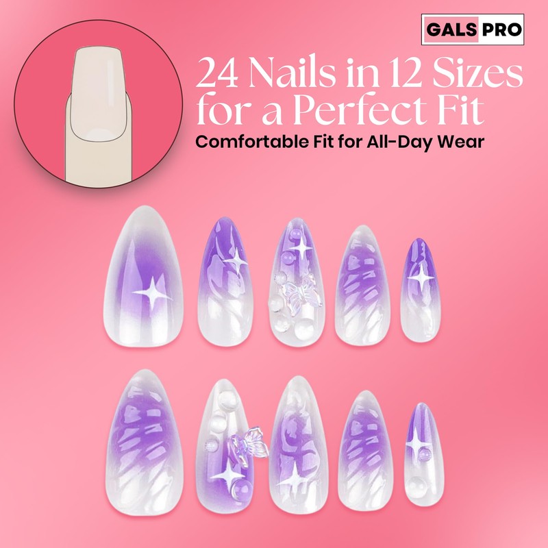 GALSPRO Medium Press on Nails - Set of 24 Fake Nails with Designs in 12 Different Sizes for Perfect Fit, Cute False Nails Kit for Women with 0.07oz Nail Glue (VIOLETGLOW ALMOND SHAPE, Medium)