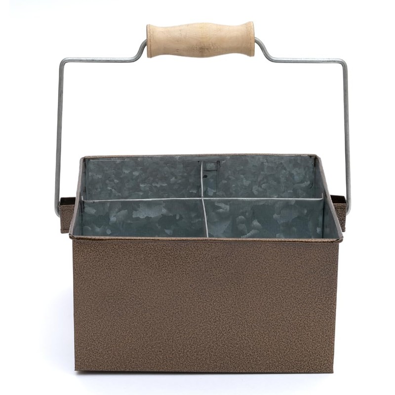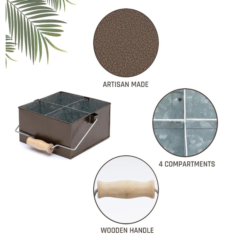Galvanized Metal Caddy 4 Compartments With Wooden Handle, Flatware Organizer, Utensils Caddy, Silverware Caddy for Kitchen Counter, Picnic, Bathroom, Outdoor, Indoor, Multi Use - Brass Antique