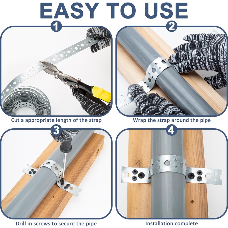 - 【Easy Installation】The product includes 20 black electroplated cap screws and 30 self-drilling screws to facilitate easy installation. The straps come with pre-drilled holes for convenience, making installation a breeze. Simply cut the strap to your desired length, wrap it around the pipe, and secure it in place with screws. The process is so straightforward that it can be completed quickly, saving time on any project.