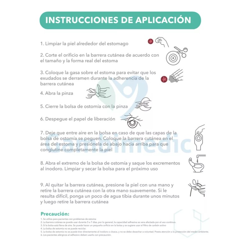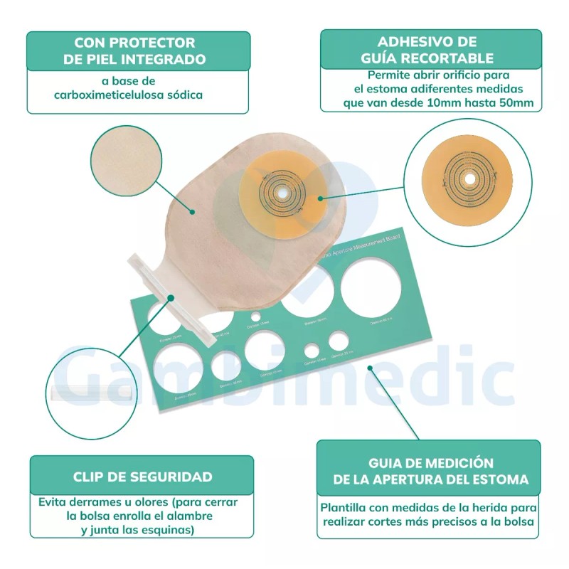 Con protector de piel integrado a base de carboximeticelulosa sódica con adhesivo, con guía recortable que permite abrir orificio para el estoma a diferentes medidas