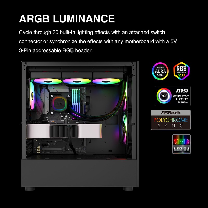 - ARGB Luminance: Cycle through 30 built-in lighting effects with an attached switch connector or synchronize the effects with any motherboard with a 5V 3-Pin addressable RGB header.