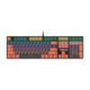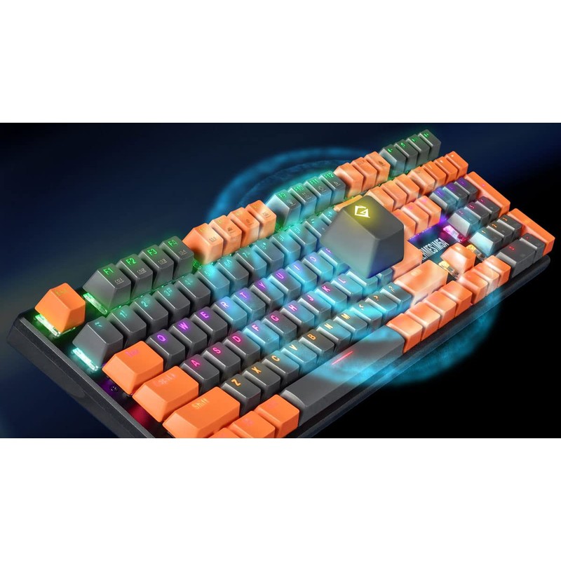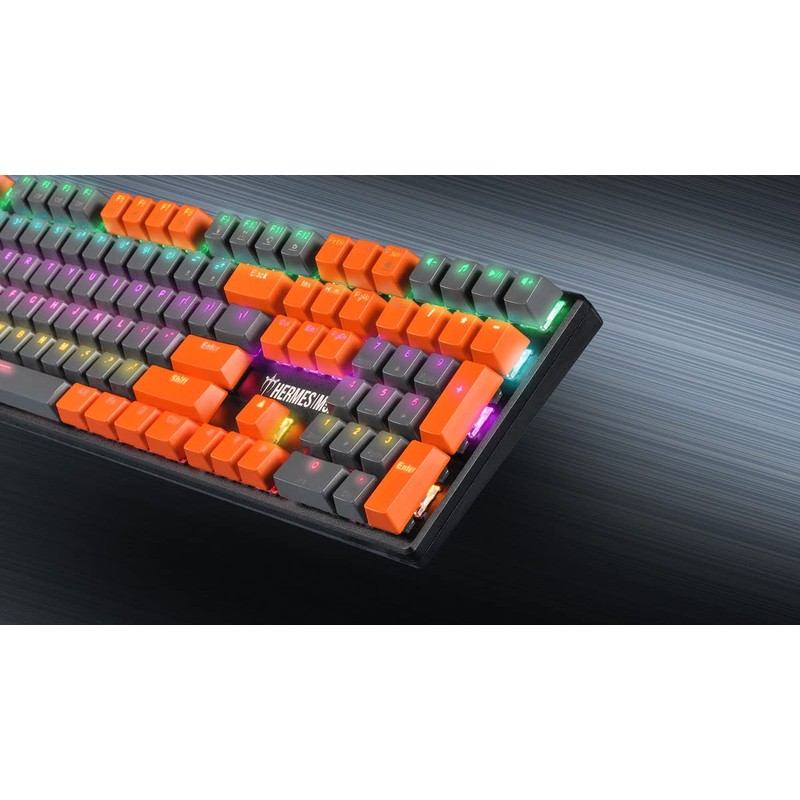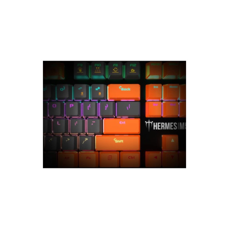 - The HERMES M5A mechanical keyboard features dual-colored grey and orange keycaps with multi-color backlit capable of displaying up to 6 lighting effects gleaming on the refined aluminum finish on top of the keyboard. Truly an agile piece of modern art