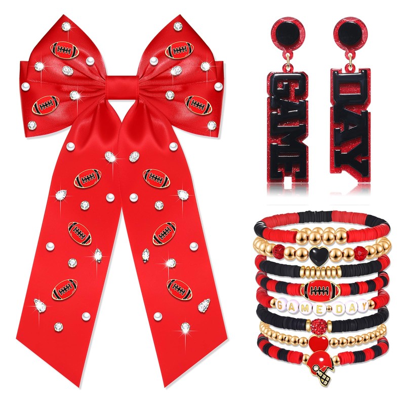 - 【Game Day Accessories for Women】: Game day is our time to shine, show the world your love of the game in style with our game day accessory! Including 1pcs beaded football hair bows, 8pcs red black heishi bracelets and 1 pair of football tassel earrings, combines elegance and team spirit effortlessly add a touch of sparkle to your ensemble. Treat you into the sport match with these football accessory, embrace the spirit of the game make a bold fashion statement and add an extra kick to your game day look!!