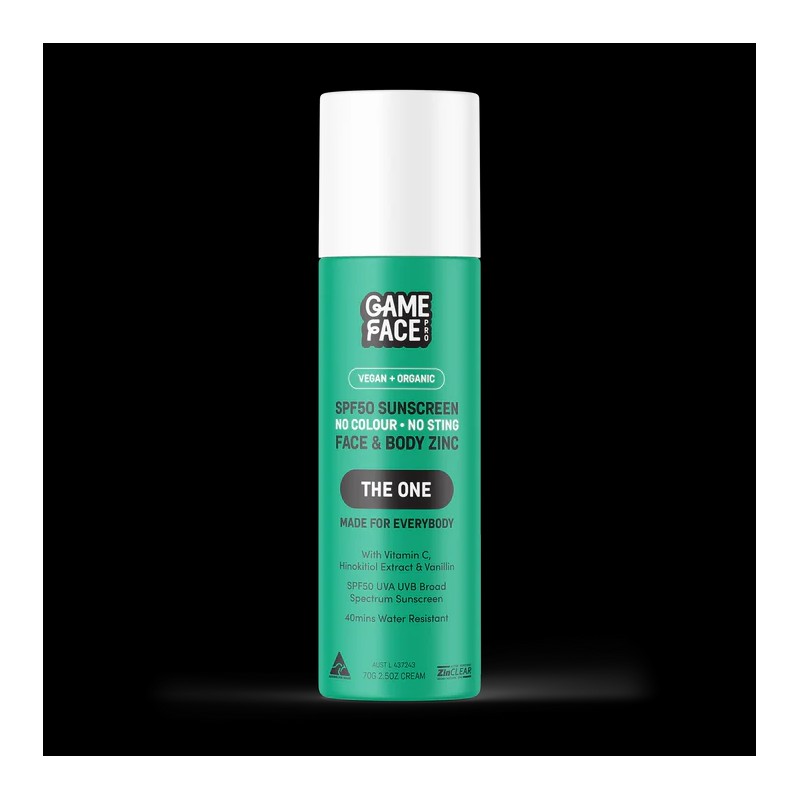 Game Face Pro 'The One' Everyday SPF50 Sunscreen Face & Body 70g is your ultimate protection against harmful UV rays. This high-performance sunscreen is designed for both face and body, providing broad-spectrum SPF50 protection. Its lightweight, non-greasy formula is perfect for everyday use, ensuring your skin stays protected without feeling heavy or sticky. The invisible zinc technology blends seamlessly into all skin tones, making it an ideal choice for anyone looking for reliable sun protection without the white cast. What are the features and benefits of Game Face Pro 'The One' Everyday SPF50 Sunscreen Face & Body 70g? Formulated to prevent stinging eyes 100% Organic 100% Vegan Non-Greasy & Lightweight Dermatologically Tested Suitable for Sensitive Skin Cruelty Free Reef Friendly Australian Made & Owned Who is Game Face Pro 'The One' Everyday SPF50 Sunscreen Face & Body 70g for? Anyone looking for a reliable, everyday sunscreen that provides high-level protection without compromising on comfort or appearance.
