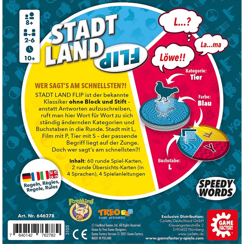 - The compact and lightweight cardboard packaging is practical for at home and on the go - and is the perfect storage place for your cards. "Stadt Land Flip" is the new edition of "Speedy Words".