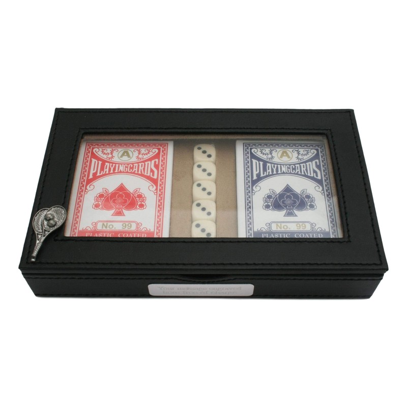 Gamekeepers Cottage gifts Tennis Racket Playing Cards and 5 Dice in Black PU Case Poker Gift With Free Engraving 370 BL