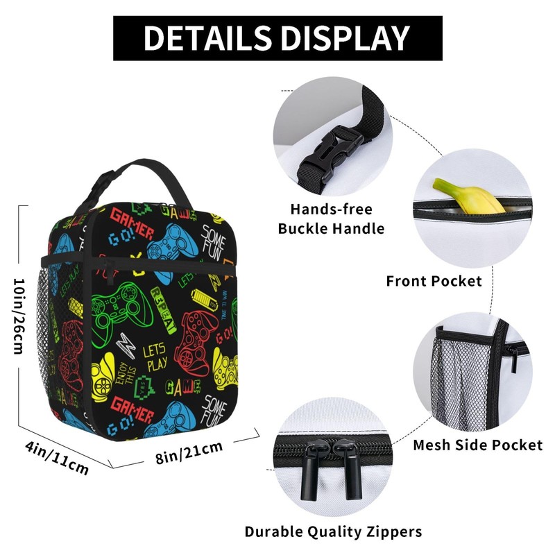 Gamepad Insulated Lunch Bag, Leakproof Portable Box For Boys Girls, Large Capacity Cooler Bag With Handle And Bottle Pocket For Kids Teens Adults Office Camping School Hiking Outdoor