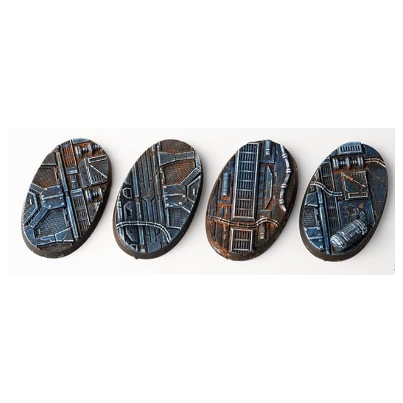 This blister contains 4 thermoplastic 60mm wide oval Battle Ready Bases, in a Spaceship Corridor theme.
