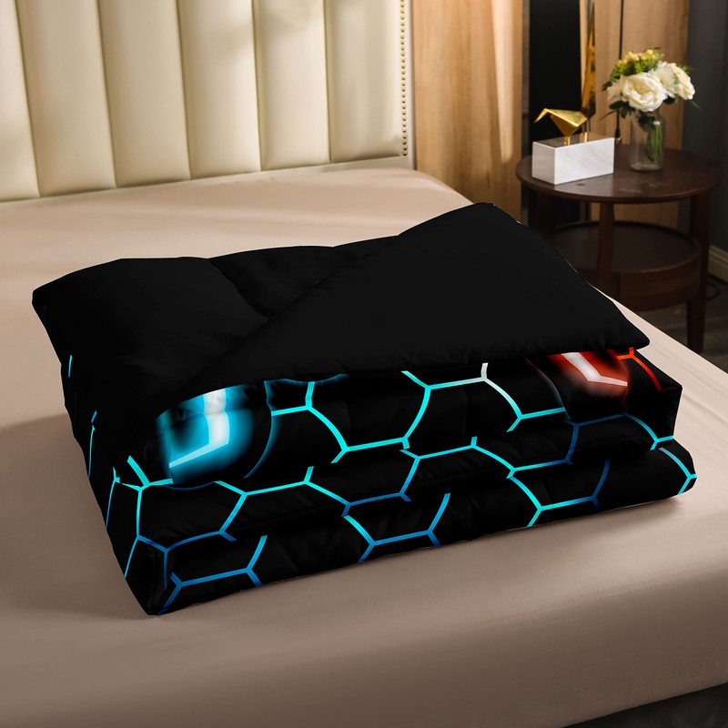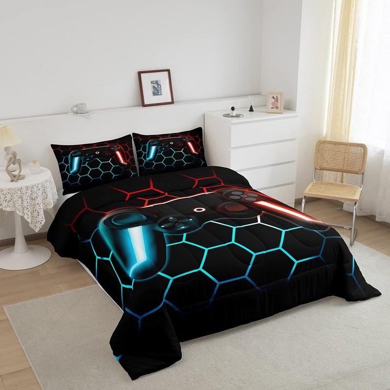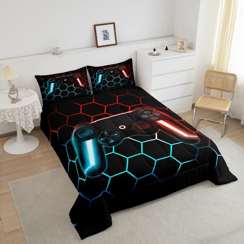 Gaming Bedding Sets Twin Size Gamer Comforter Set for Boys Girls Kids Teens Soft Microfiber Red Blue Geometry Honeycomb Down Comforter All Season Gradient Game Controller Quilted Duvet + 1 Pillowcase