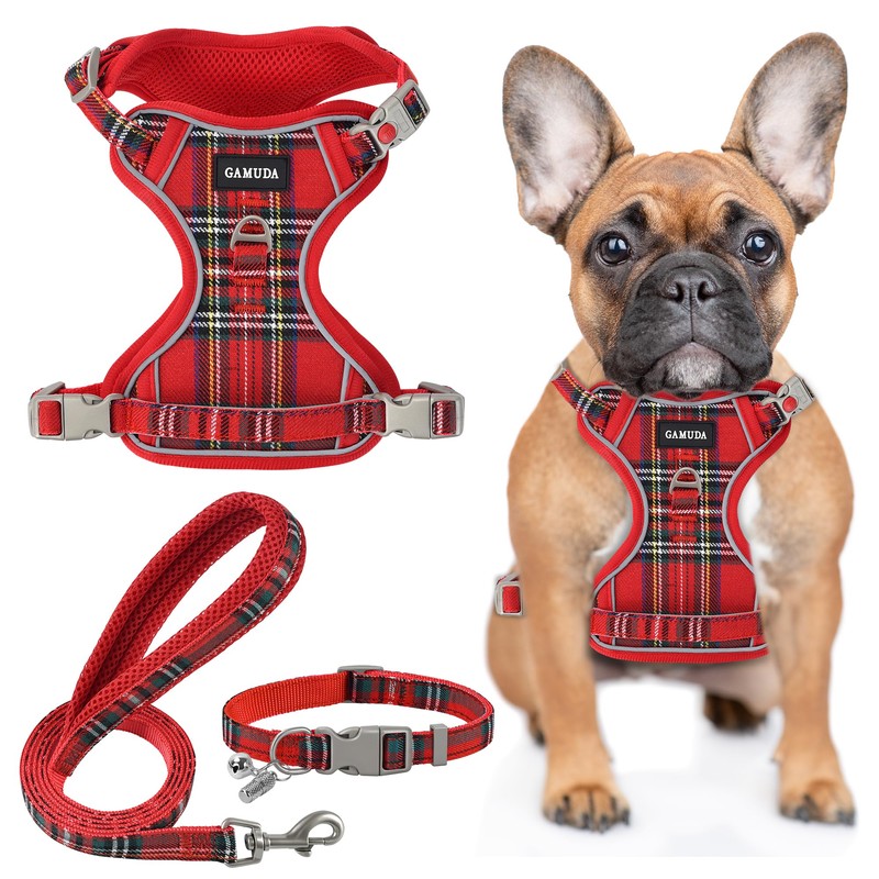 GAMUDA Dog Harness Collar and Leash Set, Dog Harness, No Chock No Pull Adjustable Vest Harnesses Plaid Reflective for Medium Dog, Cat, Small Horse, Small Bull and Pig (Red, XS)