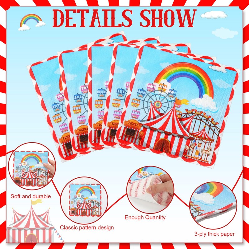 • Appropriate Size: the circus napkins are approx. 33 x 33 cm/ 13 x 13 inches, 3 layers thick, the circus paper plates are approx. 7 inches, and approx. 9 inches, suitable size for you to hold multiple kinds of foods, desserts, and snacks